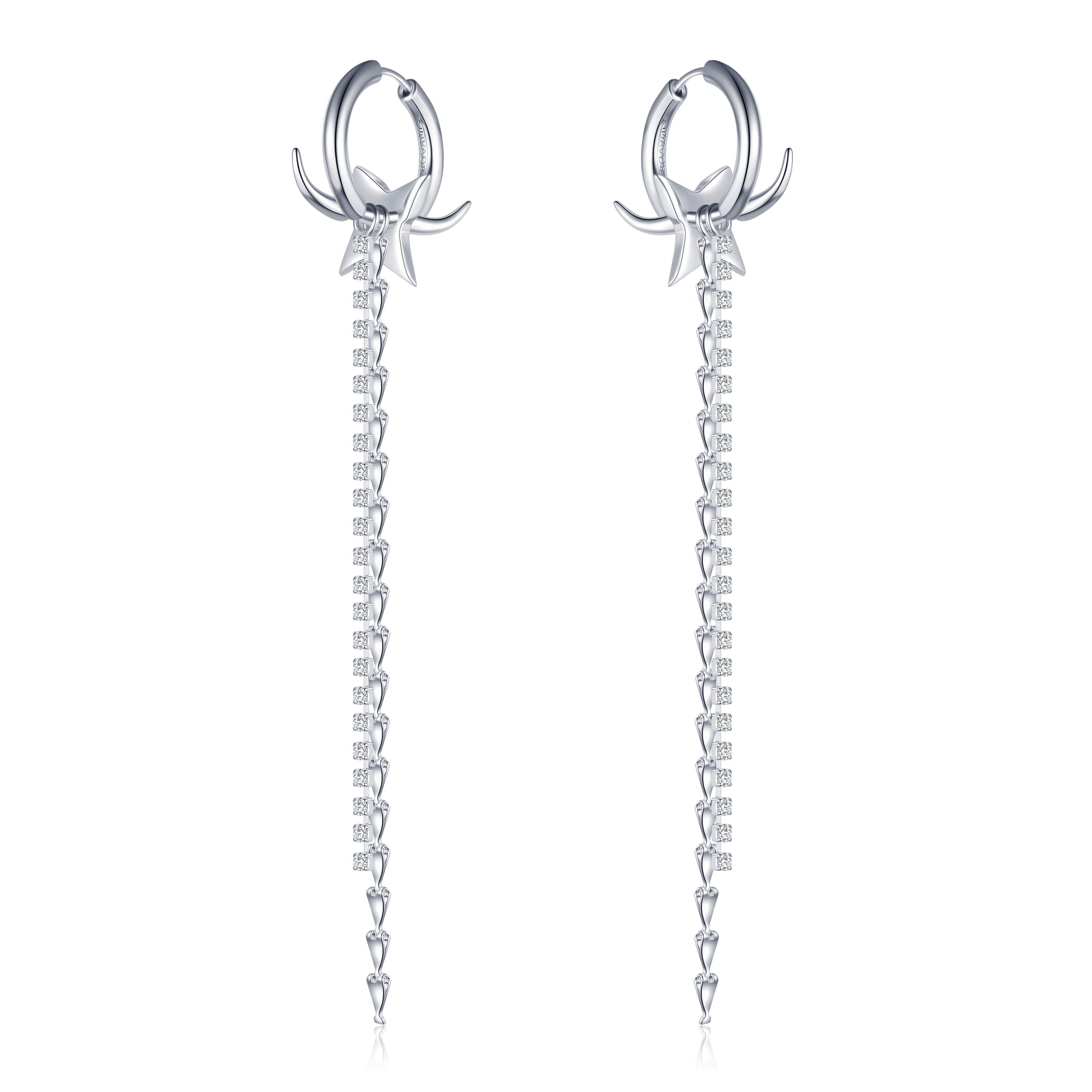 Detail: Reinventing the classic hoop with unique style, these earrings are the perfect addition to your collection. They suit multiple styles and add a modern twist with unique dart and zircon chain.