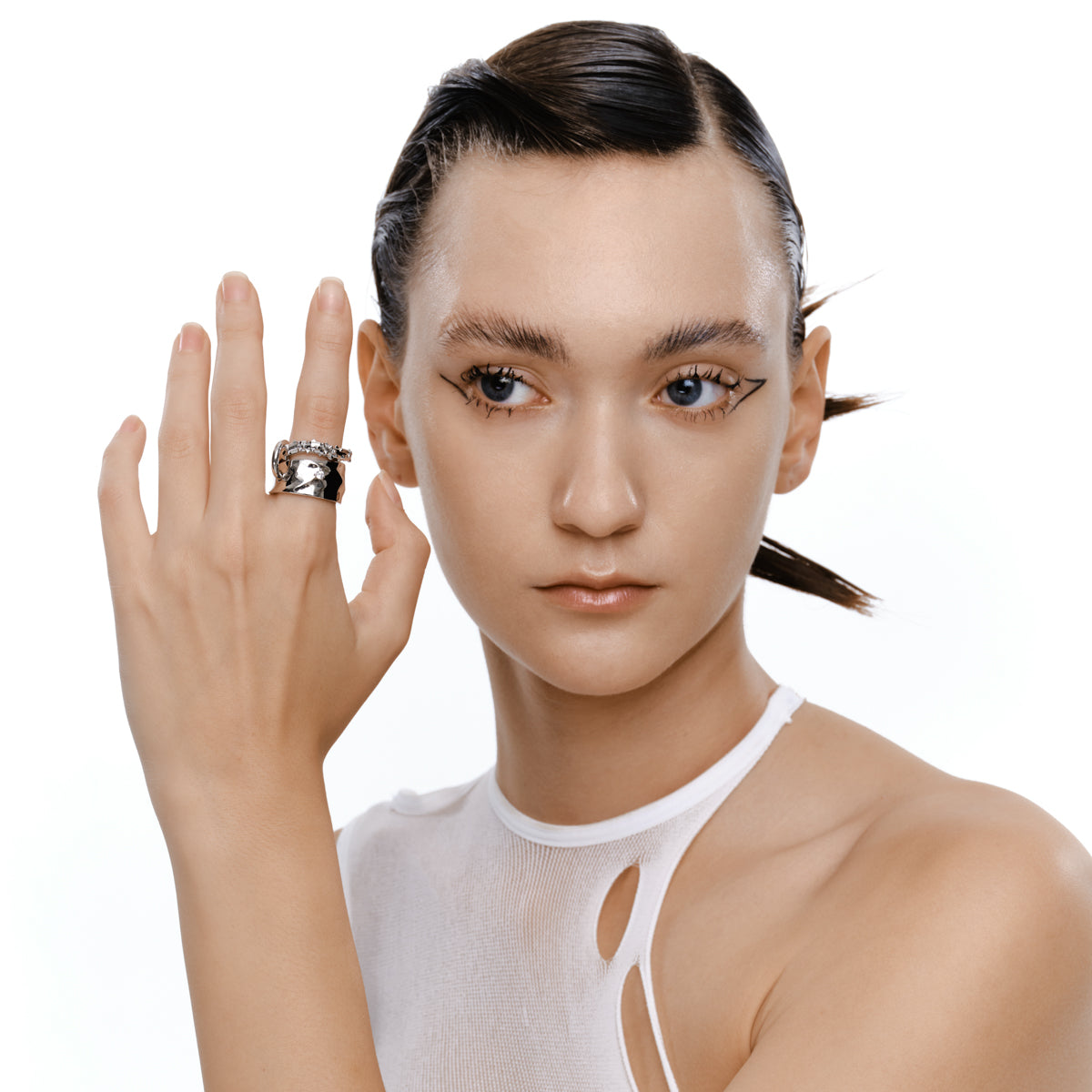 Detail: This rivet ring with a metal hoop is made with high brass and platinum plated layer of 3 microns. It is paved with a white zirconia stone.