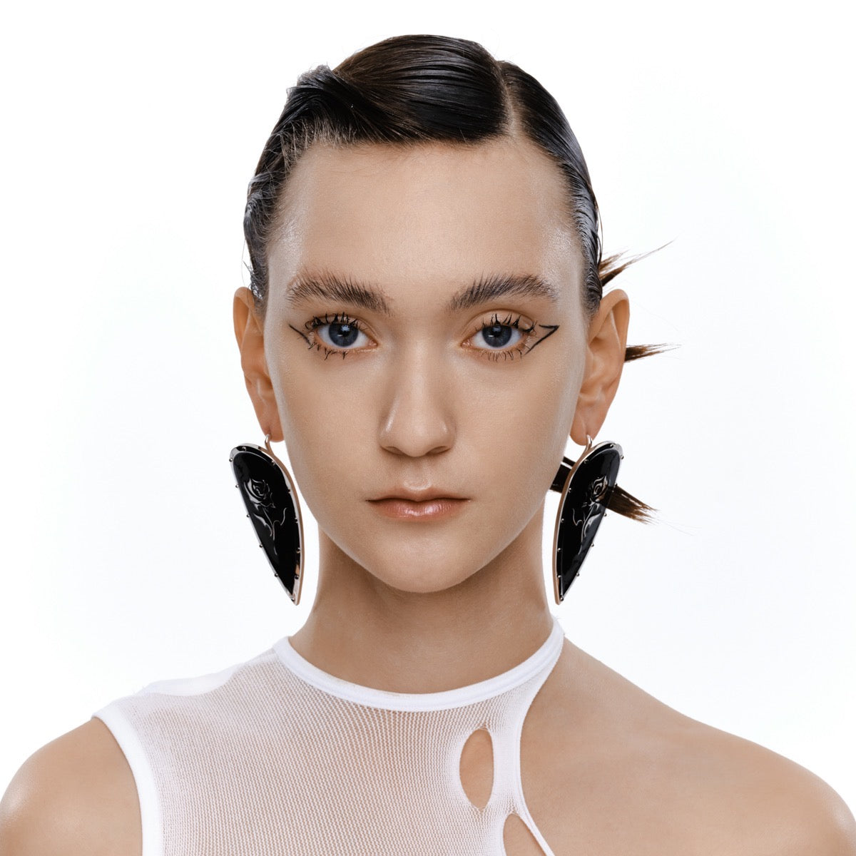 Detail: These earrings are handcrafted from high brass and platinum plated layer of 3 microns. It is embellished with black enamel for a charming color.