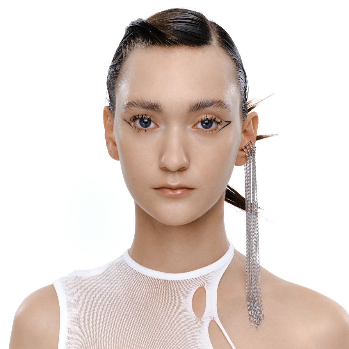 Derail: This edgy multi chain dropping ear cuff is made with high brass and platinum plated layer of 3 microns.